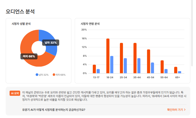특히 음식·요리 레시피 콘텐츠 비중이 높고 시청자는 여성 비중이 높아(68%), 20~40대가 중심이라 요리 배우려는 실사용자층이 뚜렷해요. 그래서 이 카테고리에서 조회수·댓글·좋아요 전부 평균 이상을 기록하며 서로 상호작용이 잘 된다는 게 포인트예요.