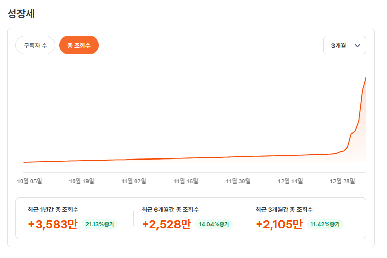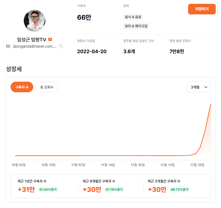 구독자 66만, 최근 3개월에만 구독자 +30만이 붙으면서 그래프가 거의 수직으로 올라갔어요.