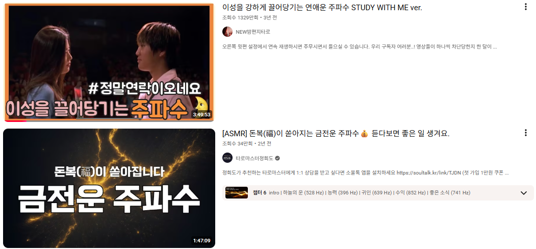 “헤어진 연인에게 연락 오는 주파수”, “틀어두면 인생이 바뀌는 주파수” 같은 콘텐츠 영상이 줄을 잇고 심지어 댓글도 진지하게 달리고 심지어 성공했다는 이야기도 있죠.
